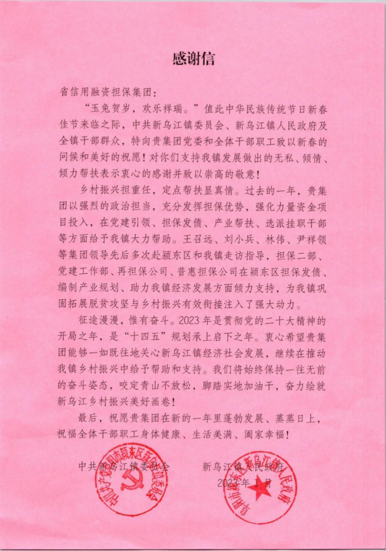 近日,新烏江鎮(zhèn)黨委、政府發(fā)來感謝信,感謝集團發(fā)揮政策性擔保機構優(yōu)勢,強化資金項目投入,在黨建引領、擔保發(fā)債、產(chǎn)業(yè)幫扶、規(guī)劃編制、選派干部等方面,全力支持新烏江鎮(zhèn)發(fā)展。